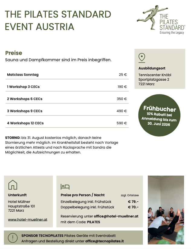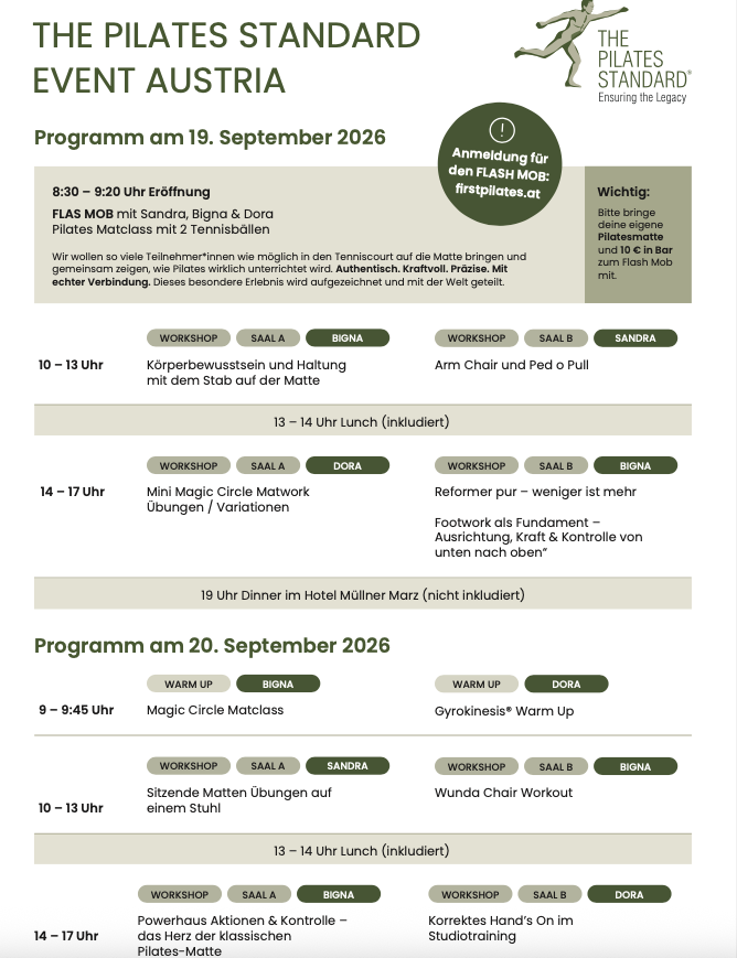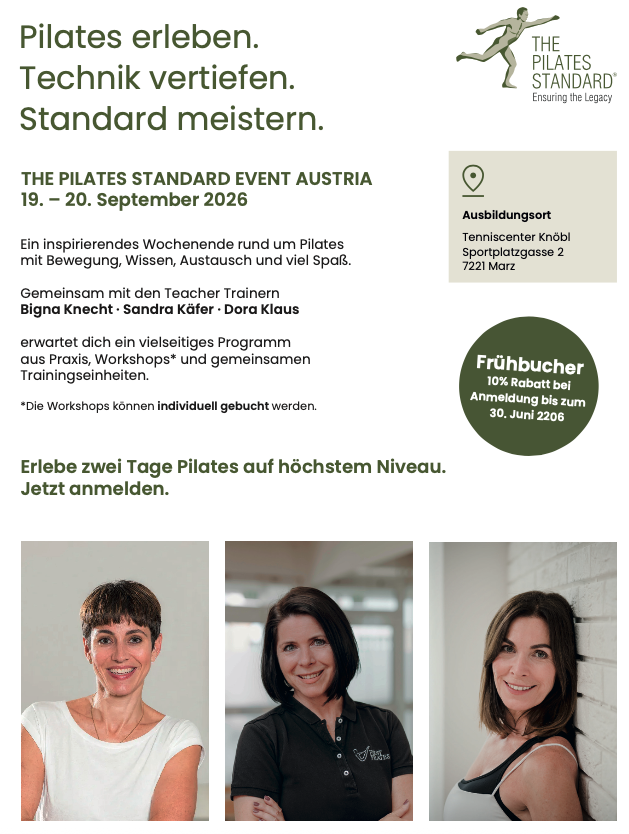 Ein inspirierendes Wochenende rund um Pilates mit Bewegung, Wissen, Austausch und viel Spaß. Gemeinsam mit den Teacher Trainern, Bigna Knecht, Sandra Käfer , Dora Klaus erwartet dich ein vielseitiges Programm aus Praxis, Workshops* und gemeinsamen Trainingseinheiten.